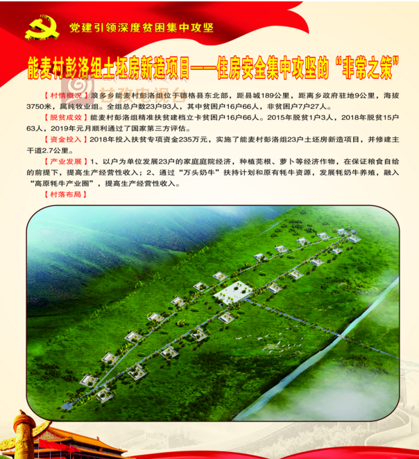【基本情况】浪多乡能麦村彭洛组,该组距离乡政府驻地9公里,海拔3750米,距县城189公里,属纯牧业组。全组总户数23户93人,其中贫困户16户66人。【脱贫成效】能麦村彭洛组精准扶贫建档立卡贫困户16户66人。2015年脱贫1户3人,2018年脱贫15户63人,2019年元月顺利通过了国家第三方评估。2018年投入扶贫专项资金235万元,实施了能麦村彭洛组23户土坯房新造项目,并修建主干道2.7公里。